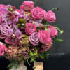 This stunning arrangement showcases a rich blend of purple flowers. Vibrant orchids with intricate petals sit at the center, surrounded by lush hydrangeas in deep violet hues. Interspersed are velvety roses in shades of lavender and plum, adding depth and romance. The combination of textures and shades creates a captivating display, perfect for any occasion.