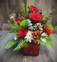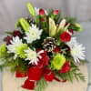 Add a touch of holiday magic with this delightful arrangement featuring lilies, carnations, and daisies in festive colors. Designed in a small crystal vase, it’s perfect for brightening up cozy spaces or as a thoughtful holiday gift. 12” h x 9”w