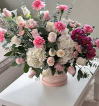 Express your deepest sympathies, and extend a gracious note to a service or memorial, with this soft spray of pink and white blooms surrounded by a farm of elegant greens.