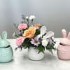 Spring flowers in a ceramic egg with bunny ears!! Perfect for an Easter gift! The ceramic container is wonderful keepsake that we have in assorted pastel colors.