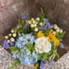 Tranquil and timeless, Still Water Blossoms is a peaceful blend of soft blues, whites, and sunny yellow. Designed in a stylish blue cube vase, this soothing arrangement features elegant blue hydrangeas, classic white roses, cheerful yellow daisies, delicate white hypericum berries, and touches of blue statice. Perfect for Mother’s Day, a thoughtful thank-you, or simply to brighten someone’s day. Available for local flower delivery in College Station, TX.