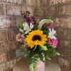 Celebrate the softer side of fall with this playful pumpkin-inspired design. An iridescent blush-toned keepsake mug holds a charming mix of fresh blooms -- including a sunny sunflower, romantic mini roses, cheerful carnations, and a whimsical mum, accented with a velvet pumpkin for a seasonal charm. With it's mix of soft pinks and creamy whites for a girly autumn color side of fall, Blushing Autumn is the perfect blend.