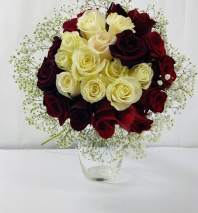 It’s a colorful bouquet with red roses, White roses, solidado en Green pompón