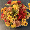 Brighten any corner of your home with The Cerulean Sun, a vibrant arrangement that celebrates the harmony of warm and cool tones. This design features a lush mix of golden-yellow sunflowers, fiery red mums, and rich terracotta zinnias. We’ve added height and airy texture with delicate seeded sprigs that reach upward, mimicking the natural growth of a wildflower garden.