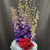 Hybrid delphiniums, blue hydrangeas, red roses, and pussy willows arranged in a sophisticated clear vase.
