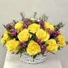 A charming white basket filled with purple, pink, and white roses, creating a soft and romantic blend of colors perfect for any heartfelt occasion.