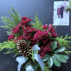 Red garden spray roses, holiday greens, millimeter ball, pinc cone.