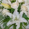 White Casablanca lilies complimented by 12 stunning white roses and seasonal greens arranged in a tall glass vase. This will WOW the recipient for any occasion.