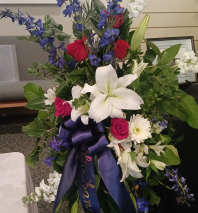 Sympathy with soft blue ribbon complimented by white carnations, lilies, mums and carnations, along with a hint of yellow carnations, alstroemeria, and snapdragons. Ribbons with titles extra.