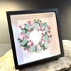 Soft pastel pink and mint-green glass pieces curve into a delicate wreath inside a crisp black shadow box frame - an artful wall piece that reads like framed floral decor. This framed wreath is perfect for Mother's Day, a springtime Easter accent, a housewarming gift, or simply to say "thinking of you"; the gentle palette and jewel-toned beads send a quietly celebratory, thoughtful message to the person you're honoring.