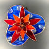 A bold red and orange stained-glass water lily mounted on a marbled blue base gives this floral arrangement the presence of a small sculpture - perfect as a Mother's Day gift or a standout birthday bouquet alternative. The stylized petals fan outward in layered, pointed shapes that catch light, while clear glass pebbles arranged across the blue background sparkle like water droplets; the result is a vibrant, modern keepsake that reads as both floral art and lasting décor for mantel, desk, or windowsill.