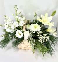 Stunning mix of white blossoms nestled into long lasting winter evergreens. Great for the holiday season, but also a beautiful mix for the New Year and into February.