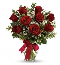 Red Roses arranged in a sweeping swirl pattern adorned with mixed greens and coffee berries.