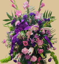 This is a lush, XL half casket spray designed to honor a life beautifully lived. Featuring a graceful blend of soft pastels, vibrant purples, gentle pinks, sunny yellows, and classic red roses, this arrangement is accented with flowing greenery and finished with a sheer memorial ribbon. Its abundant textures and soothing colors create a heartfelt expression of love, remembrance, and comfort, making it a meaningful tribute for honoring and celebrating a cherished life.