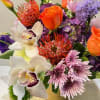 Modern Muse is a large, refined arrangement that blends soft elegance with bold color and texture. Designed in a contemporary style, it features graceful orchid blooms and layered textures, balancing delicate forms with vibrant hues. This striking piece brings sophistication and beauty to any space—perfect as a standout gift or centerpiece.