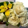 A modern and elegant design featuring white roses arranged in a sleek white cube vase, topped with a delicate orchid bloom for a refined finishing touch. Clean, graceful, and timeless—perfect for any occasion where beauty and simplicity speak volumes. Orchid color may vary based on availability.