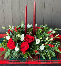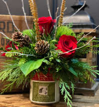 Petite cube filled with Christmas greens,berries, pinecones & mix of white & red flowers.