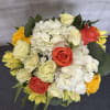 A soft, elegant arrangement featuring orange and yellow roses, white hydrangea, and creamy alstroemeria, accented with fresh green foliage. The color palette is warm and gentle, creating a cheerful yet refined look.
