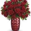 This lovely Valentine's Day arrangement features pink roses and red spray roses, beautifully accented with dusty miller and huckleberry - …