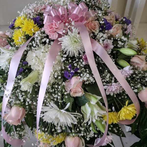 My order was timely. Delivered by a kind and nice staff. Fresh arrangement that my family loved.